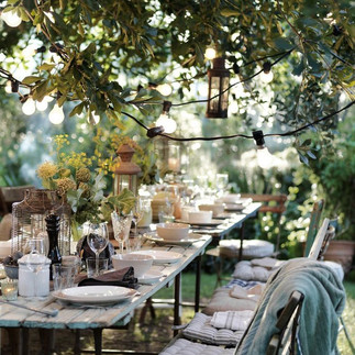 Make the most of a sheltered spot next to your house for a leisurely brunch table, especially if the sun gets too hot by the time lunch comes. Keep the look casual with dining benches and woven furniture that has a rustic feel, while building up layers of colour and texture adds to the relaxed mood. You can brunch favourites on wooden platters or boards and choose tableware that has an artisan feel. Bring in large plants in pots to help with shade – they’ll also help create the sense of an outdoor room.
